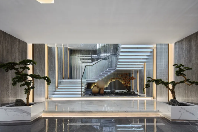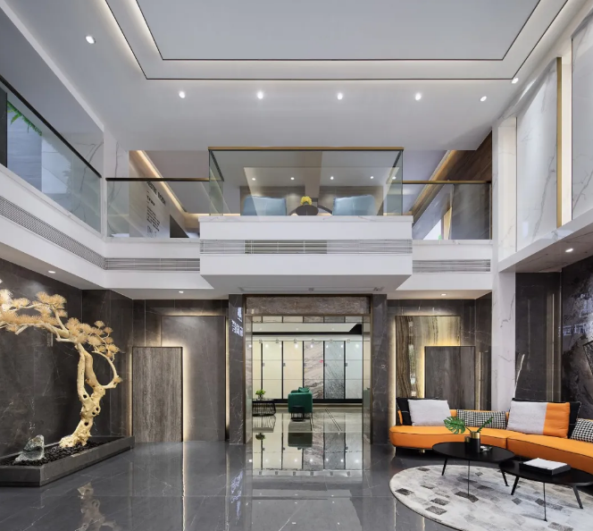 陶瓷展廳設(shè)計效果圖本案例位于深圳,展廳為臨街鋪位,室內(nèi)層高6.28米,分上下兩層,一層層高3.43米,夾層層高2.75米。本案初期現(xiàn)場勘察發(fā)現(xiàn),原鋼結(jié)構(gòu)樓梯在平面左下角,對于展廳的參觀動線不理想。另外比較嚴(yán)重的問題是,夾層建筑梁底的凈高只有2.17米,現(xiàn)場視覺很壓抑。我們將兩層空間混合使用,改變了家具比例,既保留了東方的景致又適合現(xiàn)代人的居住方式。