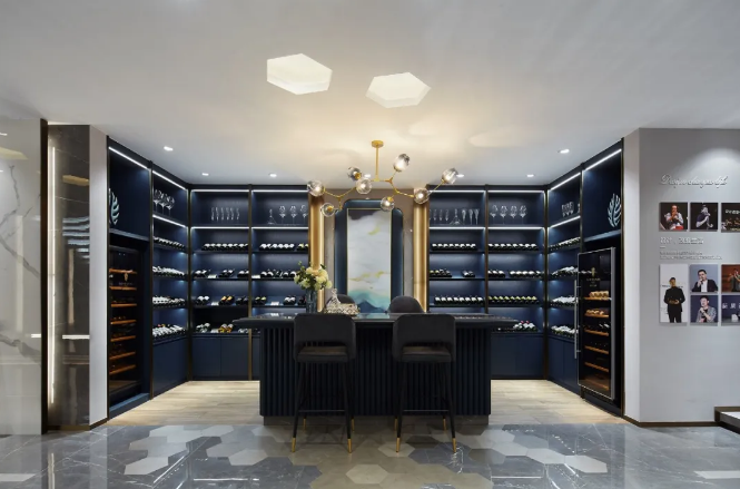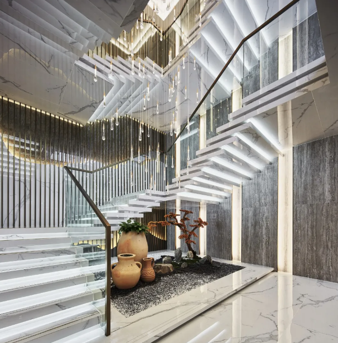 一層綜合展示區(qū)以及實景樣間,在呈現(xiàn)產(chǎn)品多樣性的同時,也讓客戶對于產(chǎn)品有所見即所得的購買體驗。設(shè)計師沙龍區(qū)將設(shè)計區(qū)與紅酒吧融入結(jié)合,讓設(shè)計師能更輕松愉快地交流、洽談。兒童娛樂區(qū)配備泡泡池,并以水刀切割工藝拼貼的卡通圖案作為裝飾背景,讓帶小孩的客戶能安心地體驗購物。通過光影與造型處理,精致、設(shè)計感十足的樓梯空間連著一層與夾層,讓客人有更上一層樓的探索欲望。